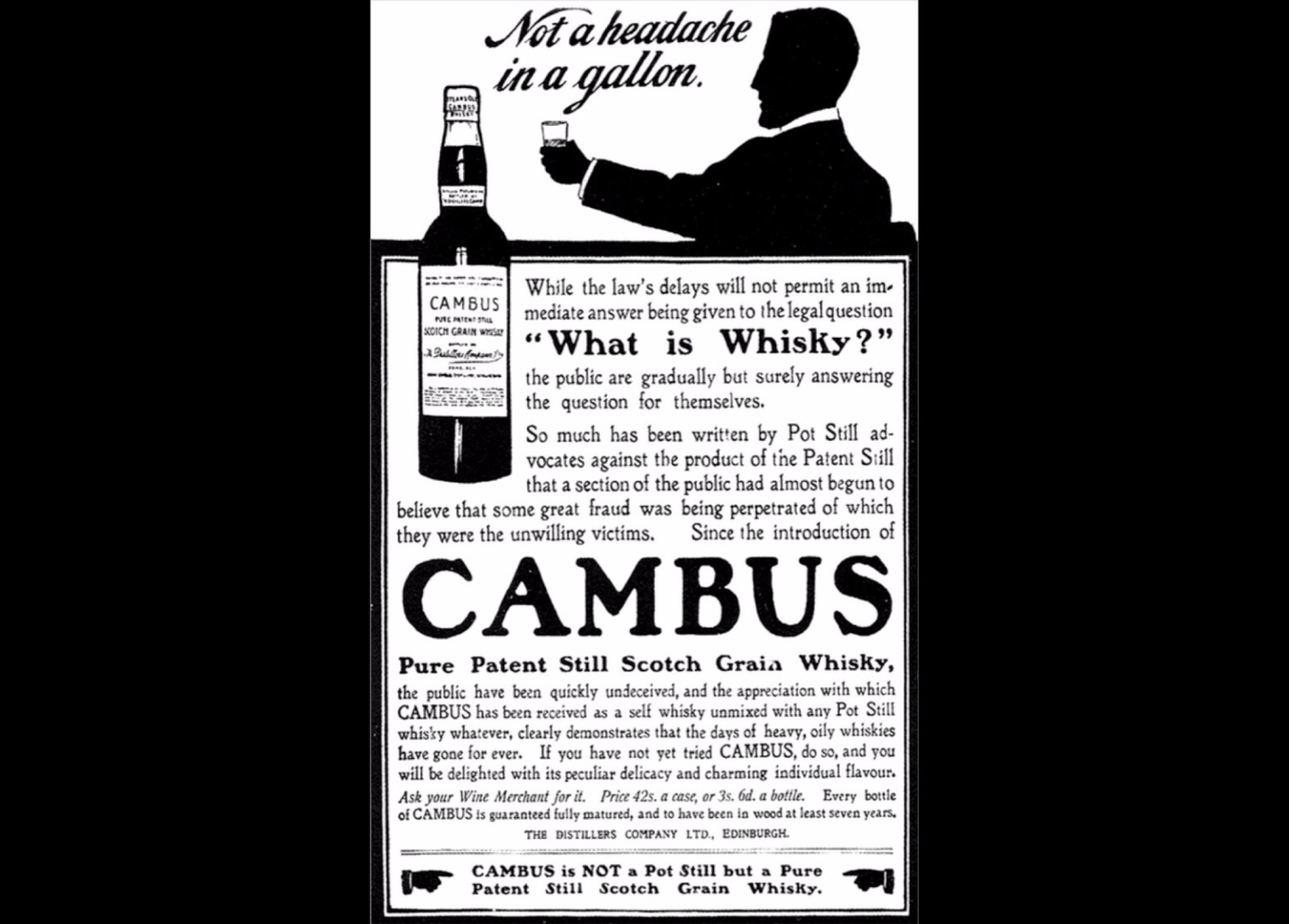 DCL managing director William Ross took to promoting seven-year-old Cambus Patent Still Scotch Grain Whisky in a national press campaign during 1906. Provocatively, the advert took pains to point out that Cambus was ‘…not a Pot Still Whisky’, using the slogan: Not a headache in a gallon.